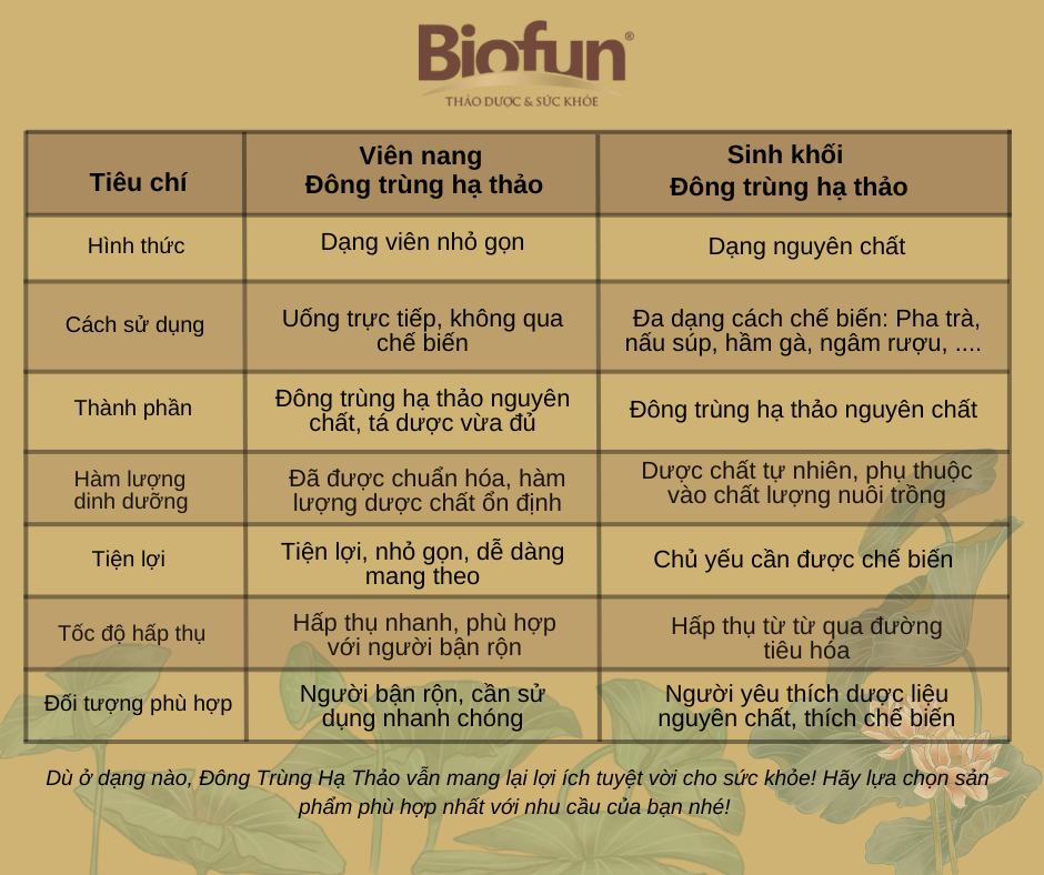 Bảng so sánh Viên nang và Sinh khối Đông trùng hạ thảo